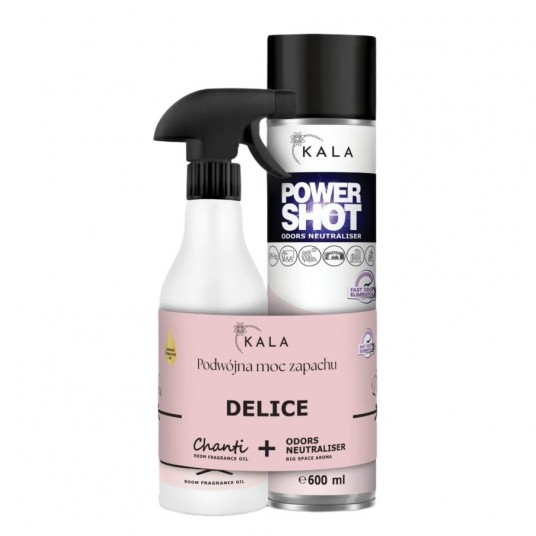 - Kala DUO PAK to dwa bardzo wysokiej jakości oraz skuteczności produkty: olejek zapachowy Kala Chanti oraz neutralizator i odświeżacz w jednym dużych przestrzeni Power Shot - Oba produkty łączy jeden zapach i promocyjna cena - Olejek zapachowy Kala Chanti Delice to profesjonalny olejek zapachowy na bazie perfum o długotrwałym, mocno pachnącym działaniu - Zawiera aktywne neutralizatory nieprzyjemnych zapachów - Dzięki skoncentrowanym, naturalnym składnikom pozostawia przyjemny zapach trwający kilkukrotnie dłużej niż inne produkty do aromatyzacji - Kala Power Shot Delice to produkt z rewolucyjnym sposobem dozowania, dzięki któremu jedno naciśnięcie wystarcza na ok. 200 m3 - Produkt posiada w składzie substancje czynne, dzięki którym ma wysoką skuteczność w eliminowaniu nieprzyjemnych zapachów tzw. neutralizatory nieprzyjemnych zapachów - Substancje czynne nie zawierają metali ciężkich a środek spulchniający nie zawiera substancji szkodliwych dla oczu