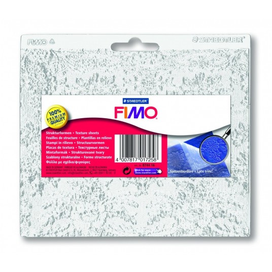 - Elastyczne arkusze FIMO ze strukturalnymi wzorami do uzyskiwania oryginalnych faktur - Bardzo trwałe i łatwe w użyciu, idealne do przedmiotów płaskich, a także o wypukłej lub wklęsłej powierzchni - Zapewniają wysoką precyzję detali na odciskanej powierzchni - Polecane do mas FIMO soft, proffesional oraz FIMO air - Nowy system opakowania sprawia, że ekspozycja towaru jest łatwiejsza - Duży rozmiar arkuszy: 168 x 150 mm - Wzór: koronka