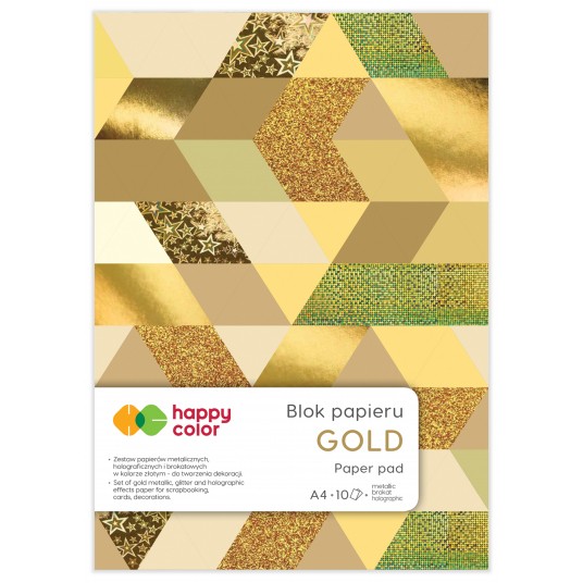 - Blok arkuszy w kolorze złotym do tworzenia dekoracji świątecznych - Zawiera arkusze grubego papieru z efektami holograficznymi mieniącymi się różnymi kolorami w zależności od kąta padania światła: (2 motywy – gwiazdki, kropki) – 230g; metalizowany typu lustro, który odbija światło (w 2 odcieniach) – 230g; papier brokatowy, mieniący się i dający niezwykłe wrażenie (w 2 odcieniach) – 150g - Doskonały do zabawy, do tworzenia dekoracji i ozdób świątecznych - Na zajęcia plastyczne w szkole i przedszkolu - Wykonane z nich dekoracje dają niezwykłe efekty wizualne - Format A4 - 10 arkuszy, 6 różnych efektów w bloku