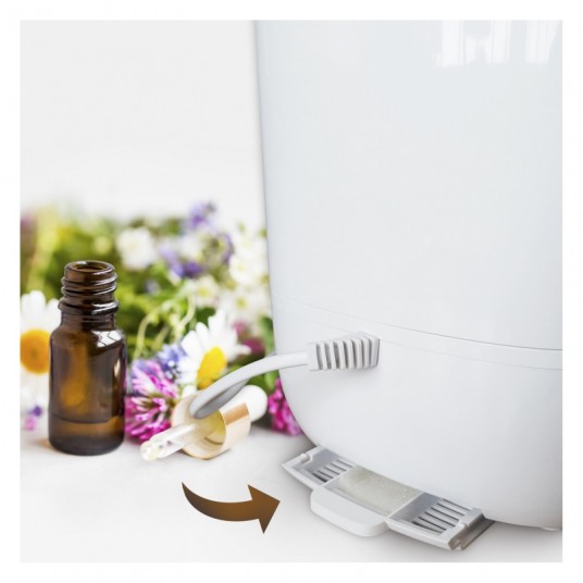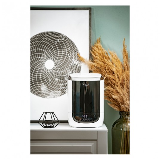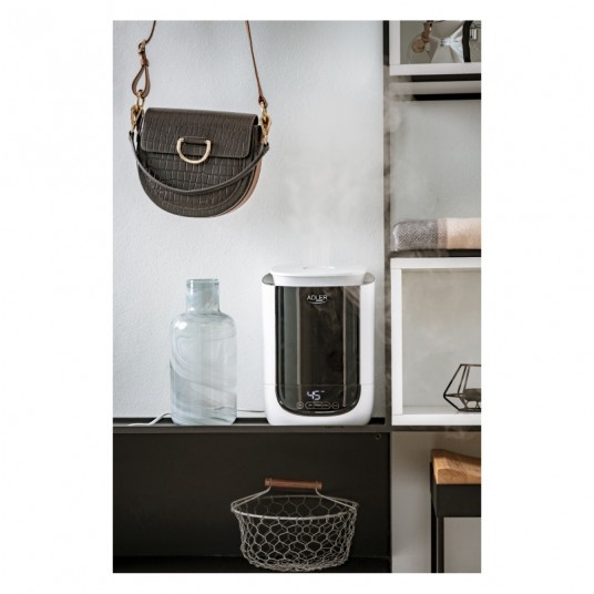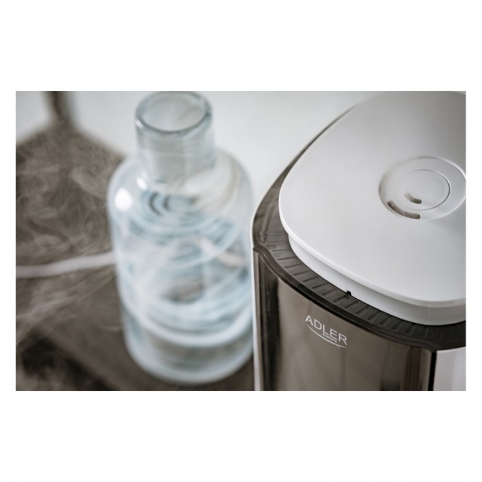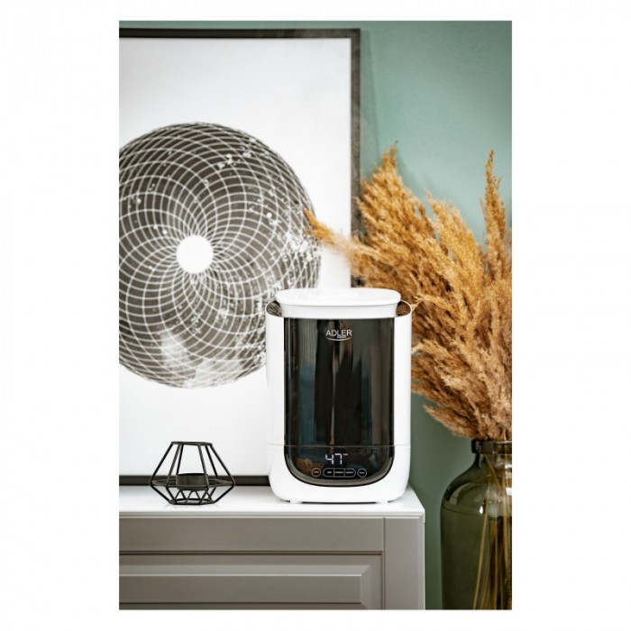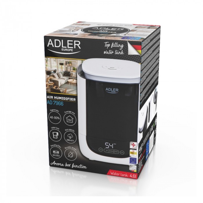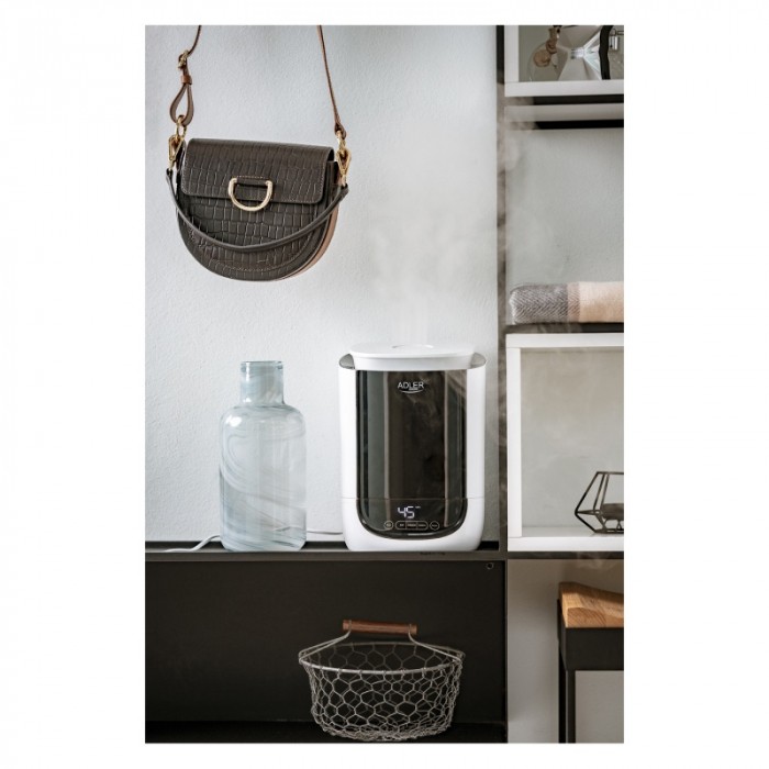 nawilżacz powietrza panel sterowania LCD zbiornik na wodę do napełniania od góry urządzenie stale monitoruje i wyświetla aktualną wilgotność wydajność nawilżania 280ml/godz. w zestawie filtr do usuwania kamienia funkcja automatycznego wyłączania – czujnik braku wody timer - automatyczne wyłączenie po 1-12 godzinach funkcja aromaterapii - dozownik olejków eterycznych 3-stopniowa regulacja intensywności nawilżania powierzchnia użytkowa do 35 m2 pojemność zbiornika na wodę 4,6 litra czas pracy na jednym wypełnieniu powyżej 16 godzin poziom hałasu
