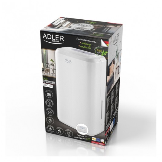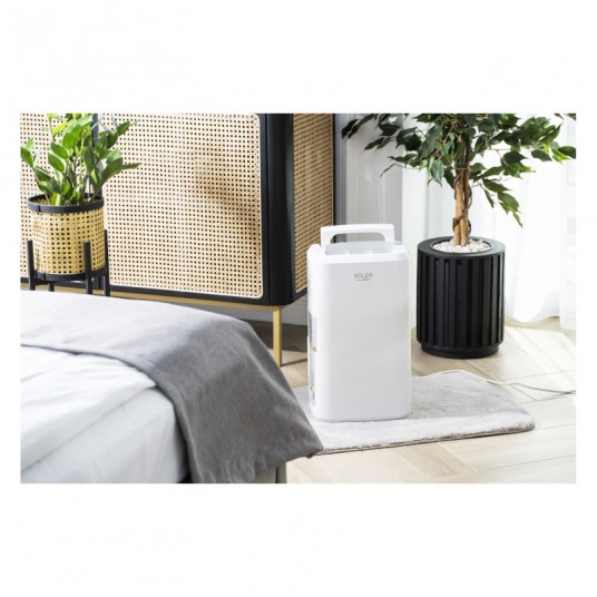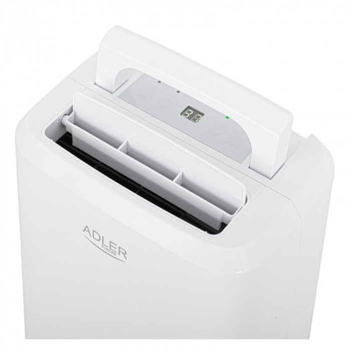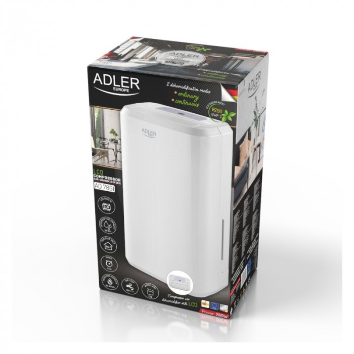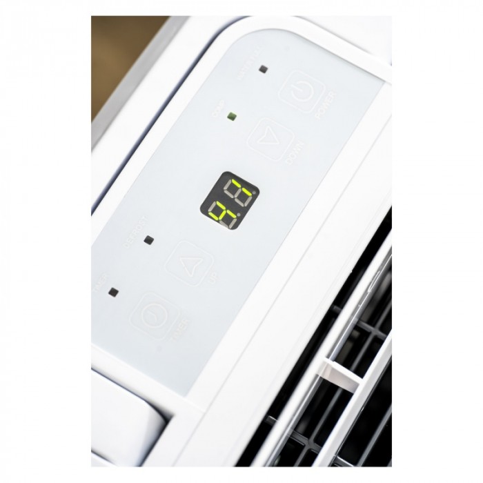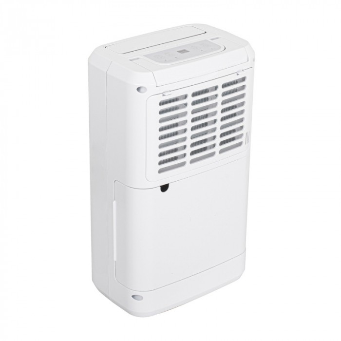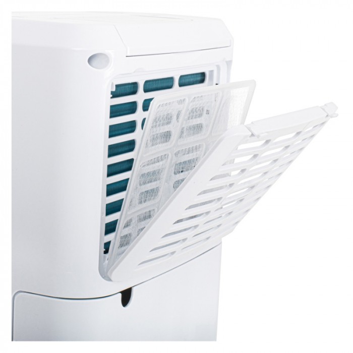 osuszacz powietrza ekologiczny płyn chłodniczy R290 bardzo niski współczynnik ocieplenia globalnego (GWP): 3 wydajność osuszania (30°C / 80% RH) - 10 litrów / 24 godziny zalecana objętość osuszania 60m3 przepływ powietrza 150m3/godz. timer od 1 do 24 godzin z funkcją opóźnionego startu zakres temperatur pracy 5-35°C wyświetlacz LCD pokazuje aktualną wilgotność w pomieszczeniu regulacja żądanej wilgotności 30-90% RH 2 tryby osuszania: - praca przerywana w celu utrzymania zadanego poziomu wilgotności w pomieszczeniu -2%/+3%RH- - ciągłe funkcja samo-rozmrażania funkcja oczyszczania powietrza przez wyjmowany filtr PP jeden poziom prędkości wentylatora pełny zbiornik na wodę sygnalizowany jest sygnałem świetlnym i dźwiękowym zbiornik na wodę 2,0 litra wąż odpływowy do ciągłego osuszania w zestawie wąż odpływowy z plastiku PP, długość: 1m, średnica: 10mm poziom hałasu < 42dB (A) wymiary (szerokość x głębokość x wysokość): 276 x 185 x 480mm waga urządzenia 9,5kg pobór mocy 280W kolor: biały