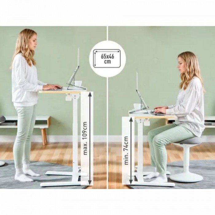 - Pneumatycznie wspomagana regulacja wysokości (74-109 cm) ułatwia zmianę pozycji między siedzącą i stojącą