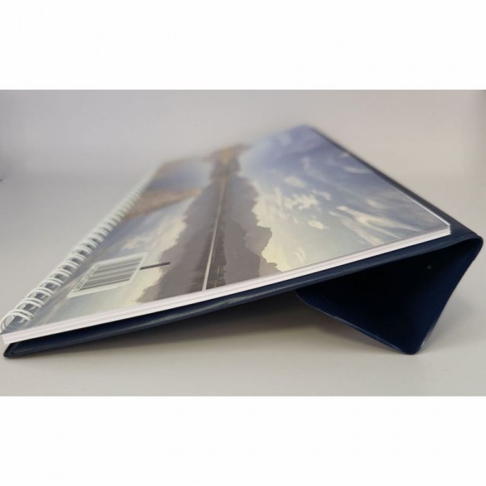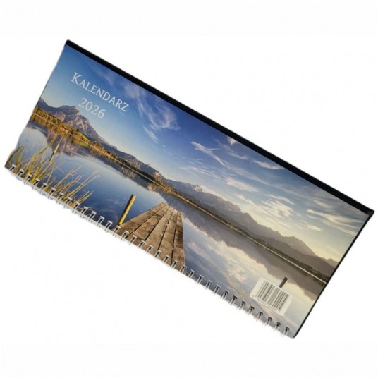 - Wymiary: 29,5 x 12,2 cm - Kalendarium: jeden tydzień na jednej stronie, w dolnym rogu skrócony kalendarzyk 3 miesięcy - Wykończenie: podstawa usztywniona PCV z możliwością położenia pod kątem, spirala (grzbiet drutowy) w kolorach białym, niebieskim lub czerwonym, kod kreskowy na okładce - Kolorystyka: niebiesko-czerwony, czarno-czerwony - Ilość stron: 56 stron - Papier: Papier ekologiczny, 70g/m2 - Opcja: indywidualna okładka, opakowania zbiorcze po 10 sztuk