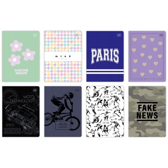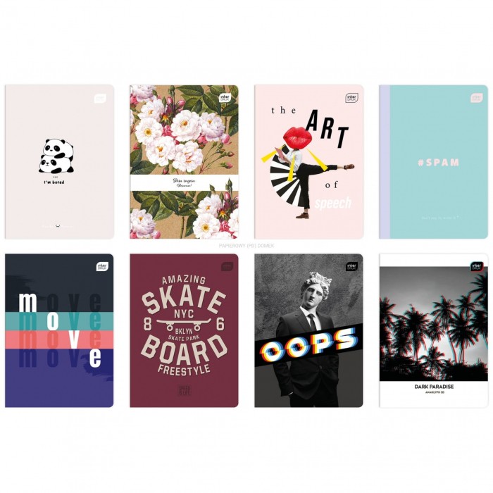 - Format: A5, ilość kartek: 16, 32, 60, 80 (krata, linie, gładki), 96 (krata, linie) oraz 16 (krata - kolor, linie - kolor)
