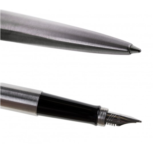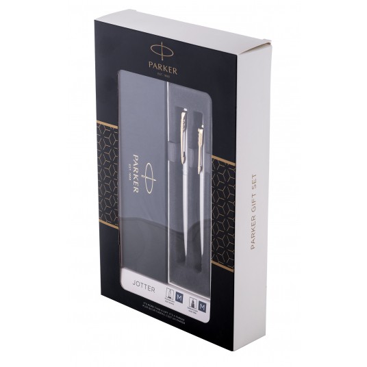 - zestaw prezentowy: długopis z wkładem oraz pióro wieczne z nabojem - marka: Parker - seria: JOTTER STAINLESS STEEL - wykończenie: GT - kolor korpusu i nasadki: srebrny - rodzaj lakieru: stal - stalówka: długopis M, pióro M - kolor wkładu i naboju w zestawie: niebieski - opakowanie: tekturowa obwoluta z przezroczystym okienkiem - idealny elegancki zestaw na prezent