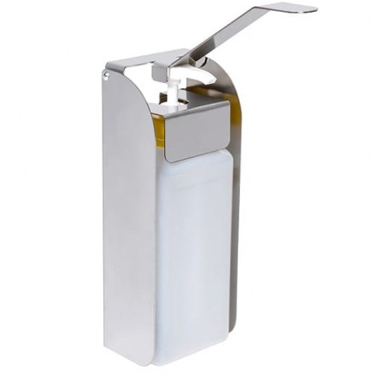 Dozownik został wykonany ze stali kwasoodpornej. Wyposażony jest w pojemnik na płyn antyseptyczny oraz pompkę wykonaną z wysokiej jakości tworzyw sztucznych