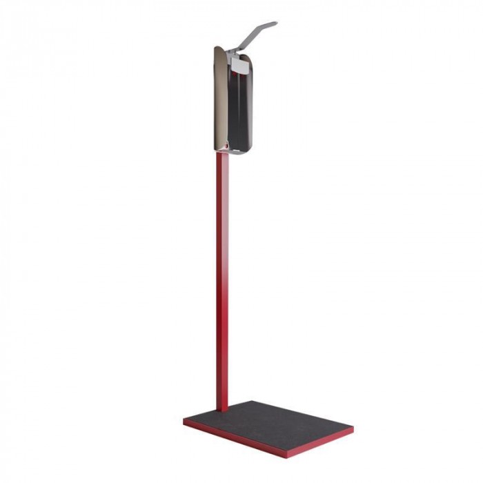 Dozownik łokciowy o pojemności 1000 ml na stojaku z matą (do wielokrotnego napełniania) przeznaczony jest do dozowania płynu dezynfekcyjnego lub mydła antybakteryjnego.
