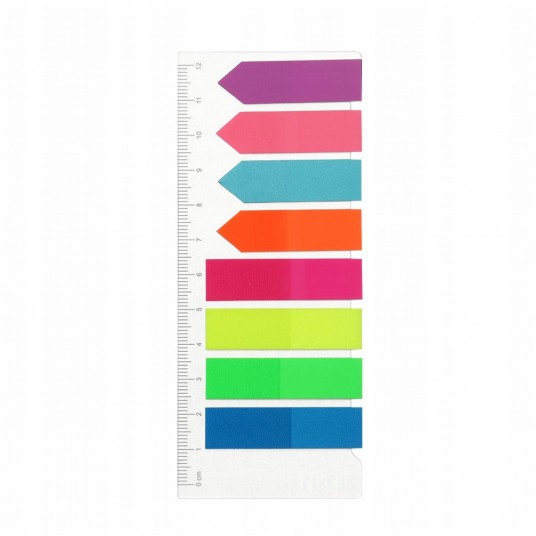 - Klasyczne zakładki indeksujące w 8 kolorach neonowych: niebieskim, zielonym, żółtym, różowym, pomarańczowym, jasnoniebieskim, jasnoróżowym i fioletowym - 8 bloczków po 25 zakładek o wymiarach 45 x 12 mm - Opakowanie zawiera dodatkowo 12 cm linijkę - Zakładki umożliwiają łatwe znaczanie i szybkie odnajdywanie ważnych informacji