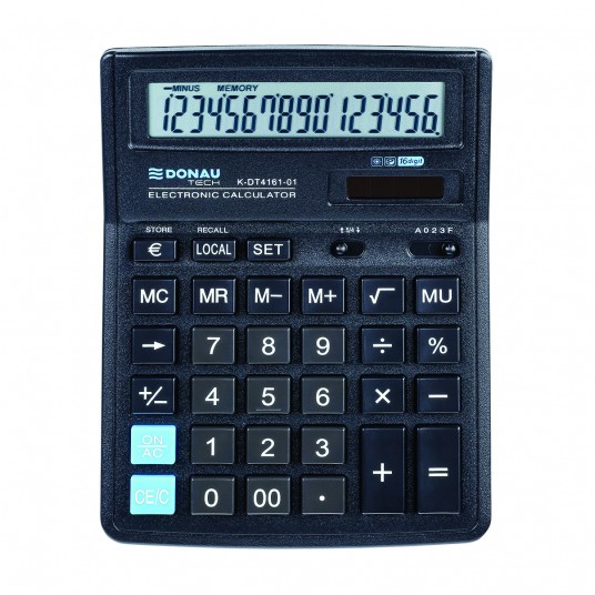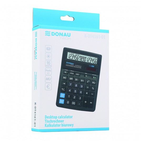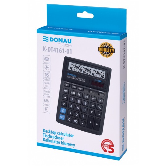 - Kalkulator biurowy z 16-cyfrowym wyświetlaczem z zasilaniem bateryjno-solarnym - Wymiary: 199 x 153 x 31 mm - Funkcja pierwiastka kwadratowego oraz obliczania procentów, obliczanie marży MU podwójne zero, kasowanie ostatniej pozycji, pamięć, ustawienie dziesiętne, zaokrąglanie wyniku, konwersja walut - Wyłącza się automatycznie - 5 lat gwarancji - Kolor: czarny