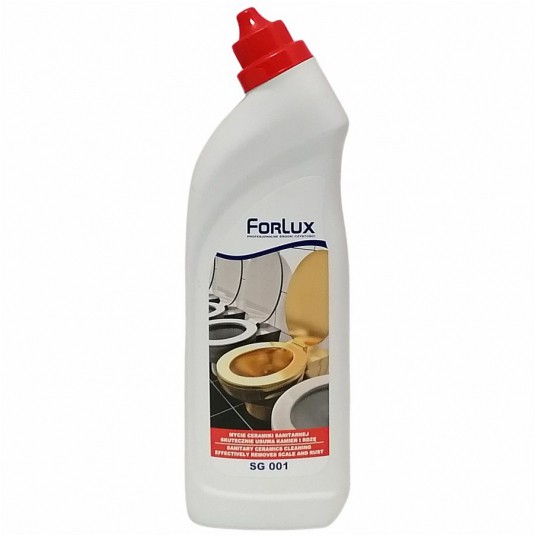 - Preparat Forlux SG 01 w postaci żelu do codziennego mycia muszli klozetowych, umywalek i armatury łazienkowej - Skutecznie usuwa kamień i rdzę - Konsystencja żelu ułatwia przyleganie preparatu nawet do pionowych powierzchni, co wydłuża czas działania i gwarantuje większą skuteczność mycia - Posiada bardzo przyjemny, świeży zapach. - Żel jest dostępny w opakowaniu 0,75 litra typu "kaczka" co pozwala na równomierne i oszczędne nanoszenie, jednocześnie ułatwiając dotarcie preparatu do trudno dostępnych miejsc. - Sposób użycia: Mycie muszli klozetowych, bidetów itp.: Preparat nanieść bezpośrednio na mytą powierzchnię, odczekać ok.10min i spłukać wodą. Mycie umywalek i armatury: Preparat nanieść na gąbkę lub ściereczkę, którymi przecieramy mytą powierzchnię, następnie spłukać i wytrzeć do sucha - Skład: < 5% niejonowy związek powierzchniowo czynny, 5 - 15% kwasy nieorganiczne, kompozycja zapachowa, CI 16255, CI 110825. - pH 1