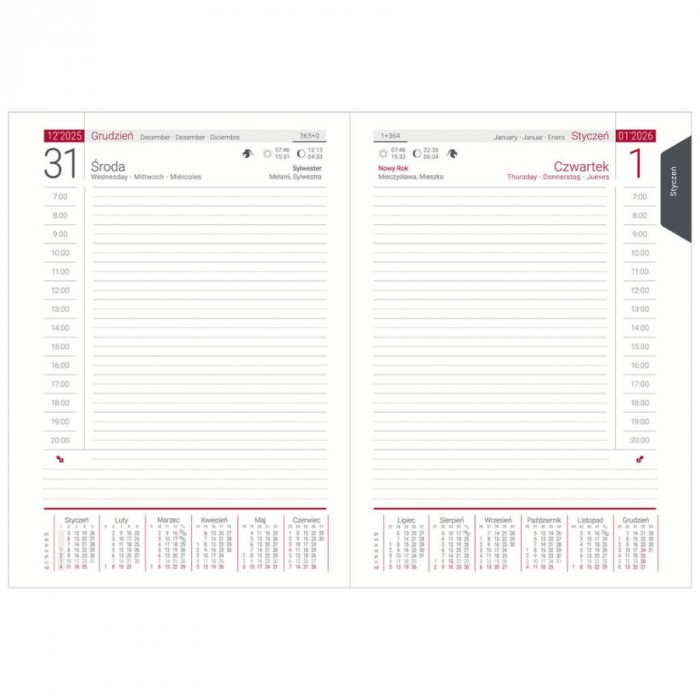- Terminarz książkowy zawiera m.in.: plan roku, wschody i zachody Słońca, fazy Księżyca, plan urlopowy, wieczny kalendarz, plan każdego miesiąca, informacje dla kierowców, wspólne oświadczenie o zdarzeniu drogowym, zasady pierwszej pomocy przedmedycznej, zasady selektywnej zbiórki odpadów, barwne mapy (PL, EU, świat, kalendarz pyleń, strefy czasowe), kalendarium 2025, 2026 i 2027, alfabetyczny skorowidz teleadresowy